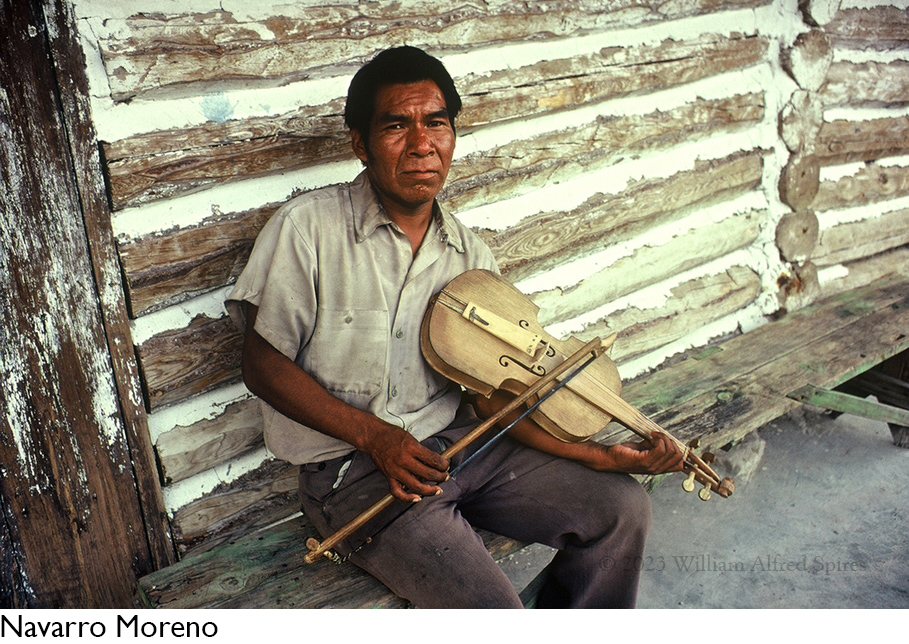In the evening I am introduced to Navarro Moreno, who works for—and is looked after by—Sr. and Sra. Pérez. He is told that I am interested in violin music. He leaves and returns with his violin. Navarro proves to be a fine musician. I learn my first Tarahumara composition from him. “El Pajaro Paseandose,” the sense of which I take to mean “a strolling bird, out for his diversion.” Many tunes follow, one to raise the sick, one to dedicate corn beer (tesgüino) for a fiesta, a farewell tune after fiestas, and more. Navarro is gracious, shy, keenly interested in me and my fiddle.